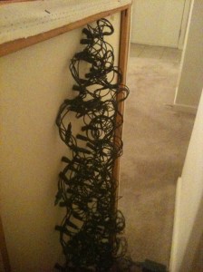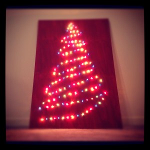 The original instructions advised me to secure each light with hot glue, but that seemed like a lot of trouble. It also seemed incredibly permanent, and I wasn’t sure whether I would be able to change any bulbs that burned out if they were glued in. Sure enough, after I unplugged the strand and moved the finished product across the room, none of the red bulbs worked when I plugged the lights back in.