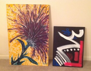 I think it must be ex-boyfriend art. I mean, the canvases are in great shape, other than what’s painted on them. The one on the left is almost passable, except the longer you look at that big purple flower, the more uneasy and antsy it makes you. Or maybe it’s just me. Art. You know. It’s weird.
