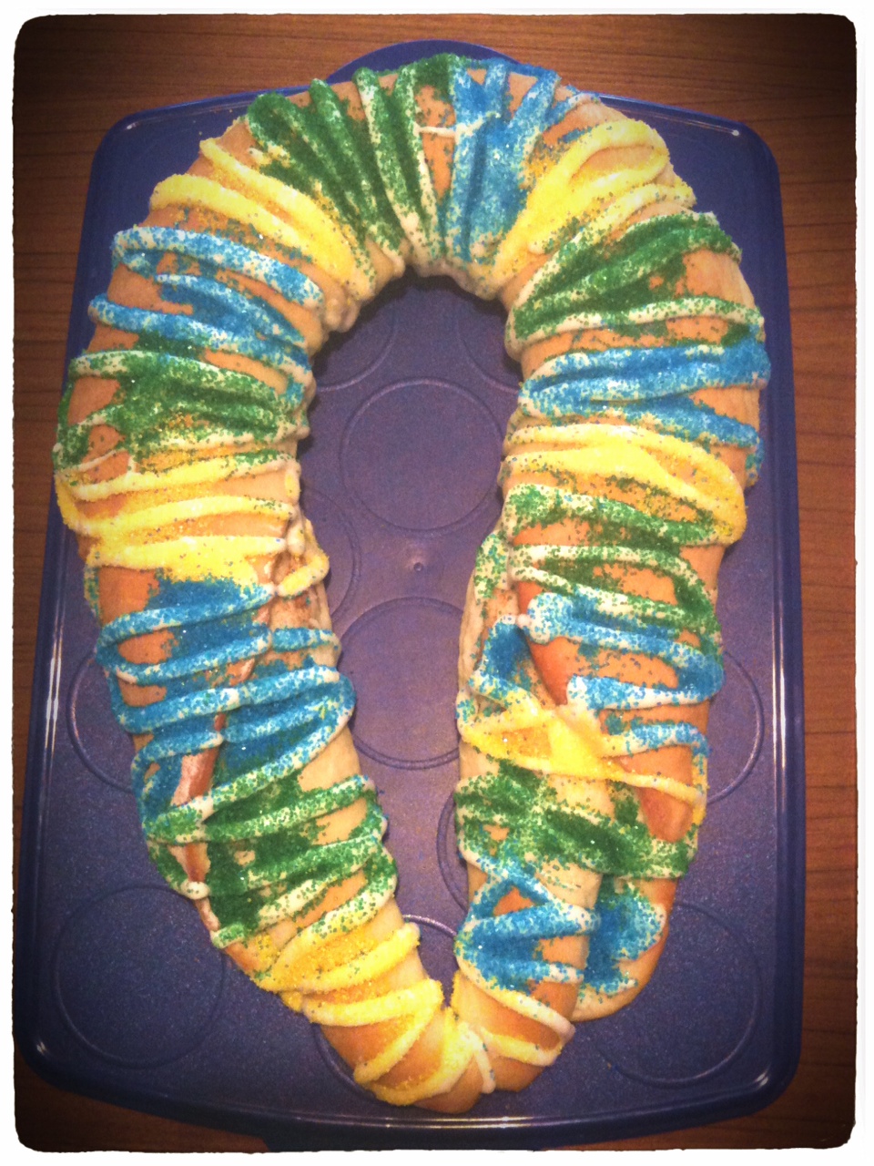 I gave up on finding an authentic, reasonably priced king cake in Huntsville this year. The king cakes at Publix have gone downhill since the days in which the bakery reportedly imported simple, unbaked cakes from Louisiana, baking and decorating them in the days leading up to Mardi Gras. This year, the offerings were filled with cream cheese in various artificial flavors, and I’m tired of bakeries trying to complicate the king cake. It’s SUPPOSED to be relatively simple. By the time you combine a thick, sweet filling with powdered sugar icing AND a heap of colored sugar on top, you’ve got a sickly sweet concoction that in no way resembles a traditional king cake.