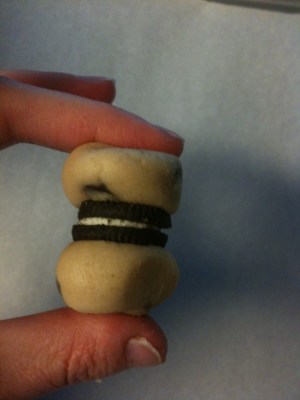 I used mini Oreos instead of the full-sized cookies, since blog after blog warned me that these cookies were ridiculously oversized. Since I don’t own a cookie scoop of any size, I weighed small balls of cookie dough on my digital kitchen scale. Two .5-ounce dough balls covered each cookie.