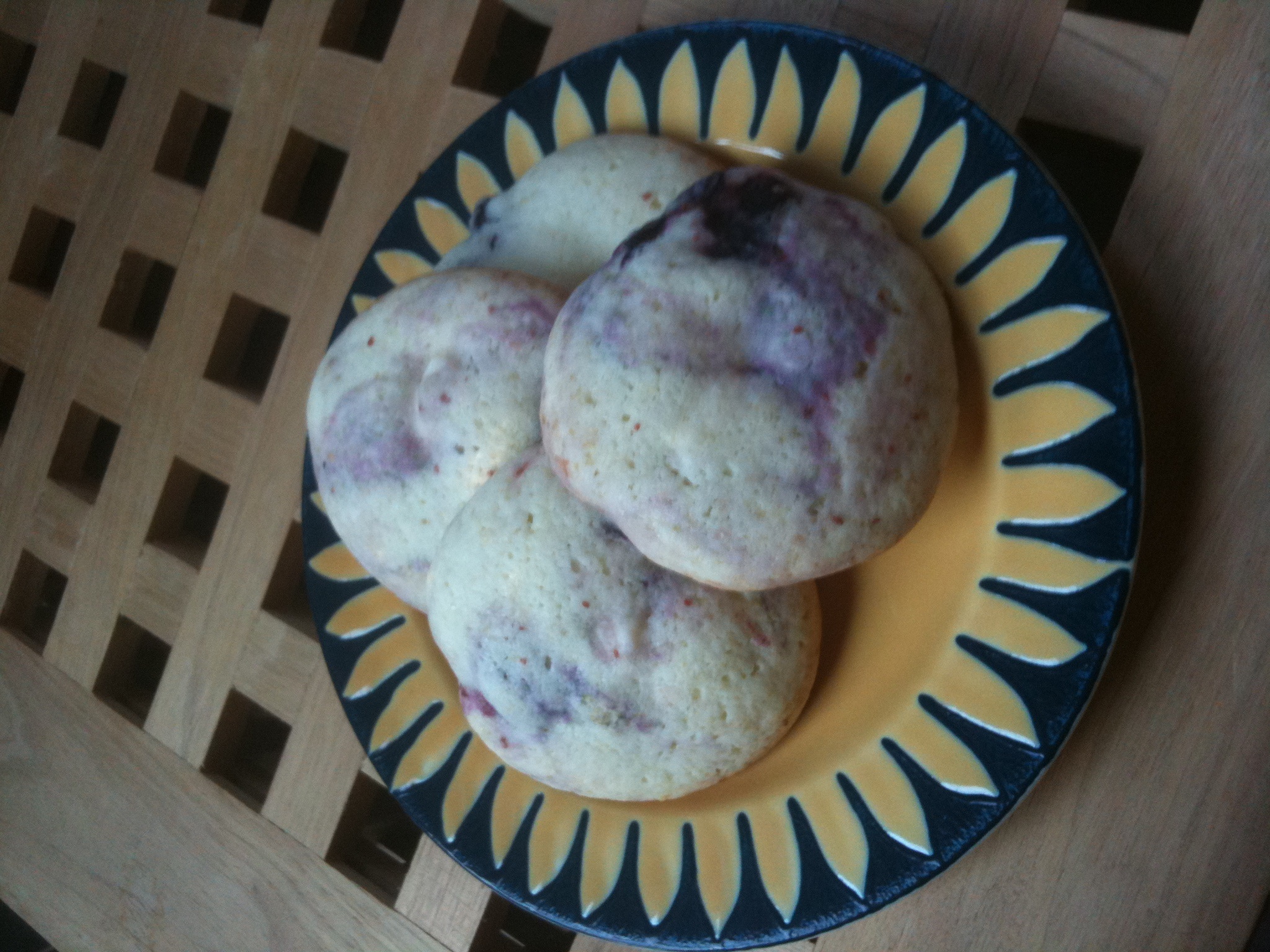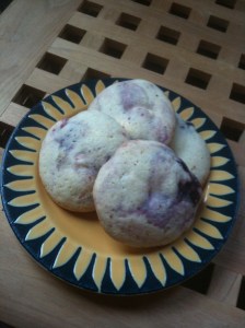 Next time, I think I’ll leave the blueberries out of the dough entirely, and then mash a couple of frozen blueberries into each ball of dough before baking. Mushy problem solved.